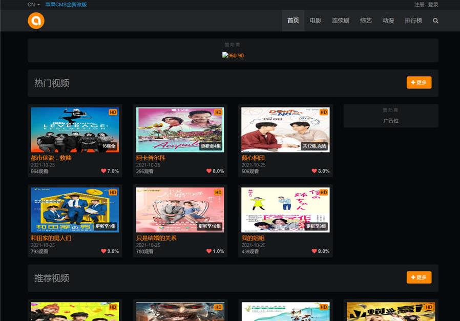苹果cmsV8响应式黑色风格模板,已测试完美无错,只有影视功能,响应式布局,非常简单。