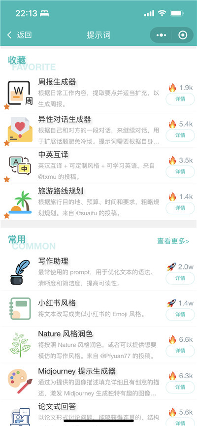 内置了近300种提示词,包含小红书文案书写、周报生成、异性对话生成器等。同时,还在开发中的功能包括AI生成图片和语音转换等。