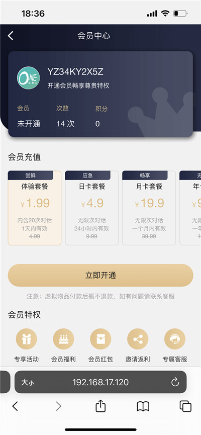 包括ChatGPT聊天、用户聊天次数限制、分享得聊天次数、每日领取免费次数、查看及清除聊天历史、显示连接情况、清除聊天历史、开通会员、购买次数包、联系客服领取次数、看广告得次数等。