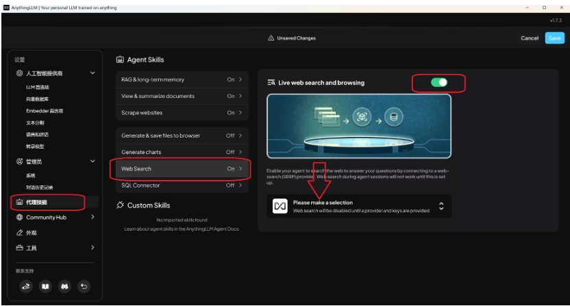 只需在AnythingLLM的设置界面中,找到“代理技能”选项。 启用Web Search:在代理技能列表中找到 Web Search ,点击开启。 选择搜索引擎即可!