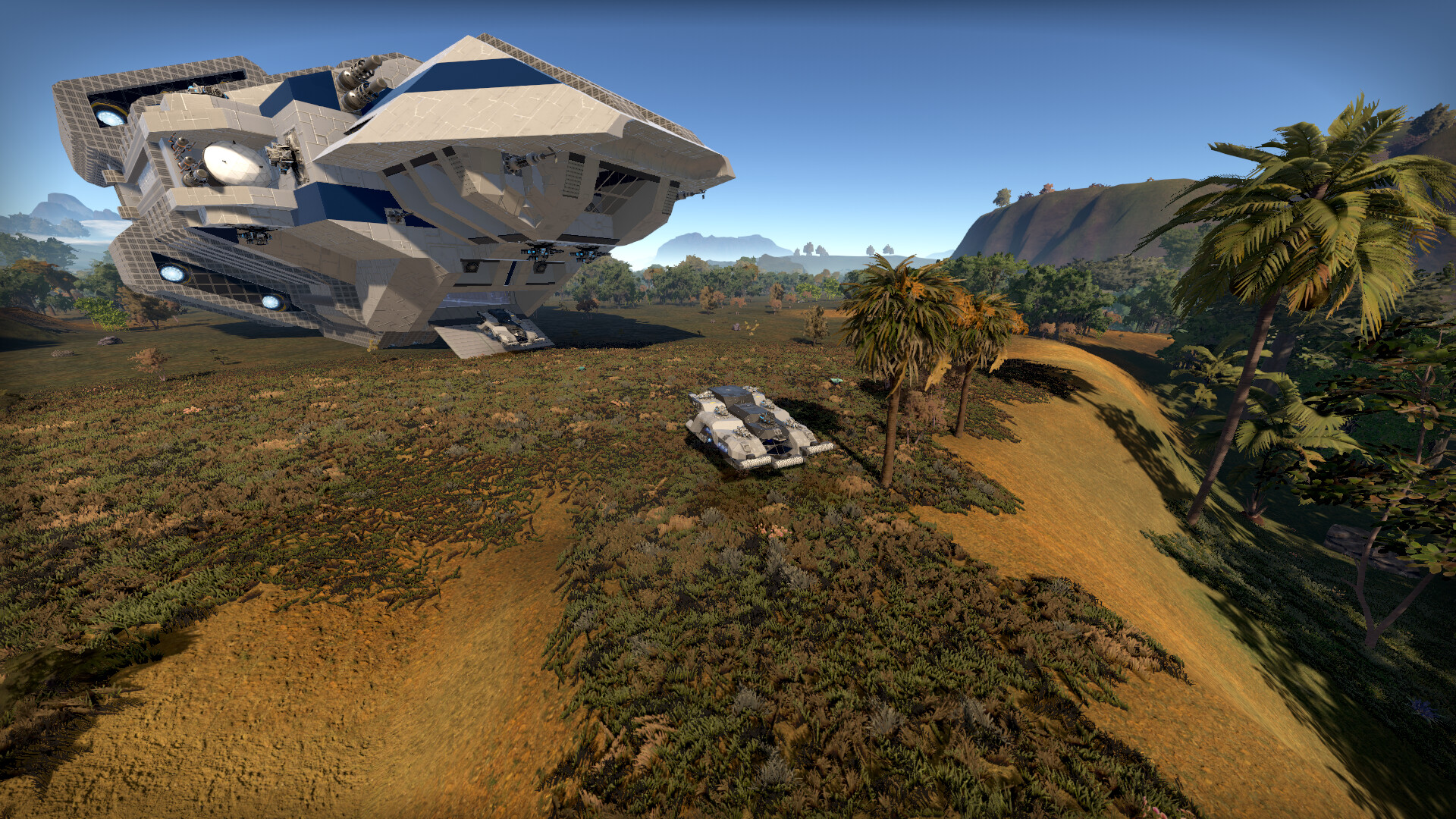 你可以自行建造你想象中的大型宇宙母舰,小型战舰,宇宙空间站和各种奇形怪状的行星基地。——也可以去Steam创意工坊下载一个蓝图,修修改改成你的自定义建筑或飞船。
