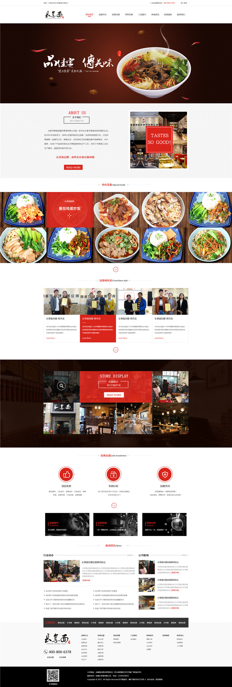 这是一个精美的扁平风格餐饮招商加盟中文PSD网站模板,logo采用了中国毛笔字+印章的设计风格。banner简约但“味道十足”,关于我们的图片上的红底白字可以采用鼠标附上去渐渐显示的效果。特色菜肴栏目精美图片陈列,让人一饱眼福。店面展示鼠标浮动上去显示放大镜效果。其他方面的设计也是比较有特色的。