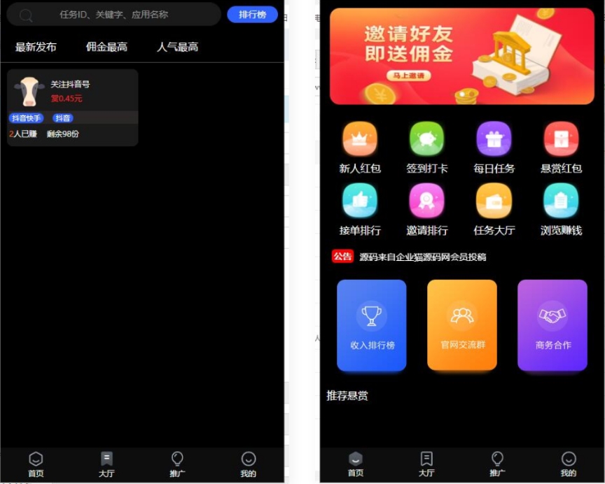 6、支持轮播图、公告、任务搜索、按人气、佣金、时间搜索等。