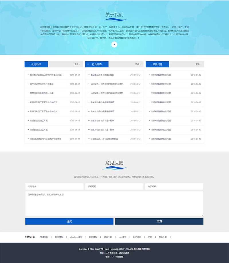 模板介绍 pbootcms活动板房产品展示型网站模板,PC+WAP,蓝色科技风格,该模板适用于彩钢板网站、临时活动房网站等企业。 资源下载下载价格5 ADD币VIP 8折、终身VIP免费立即购买仅学习交流,商用请买正版,一切后果由下载用户自行承担。若侵犯了您的权益,请来信通知Email: support@addprofans.com。购买即默认同意我们的政策。 原文链接:https://addprofans.com/pbootcms-movable-board-house-products/,转载请注明出处。 0 0