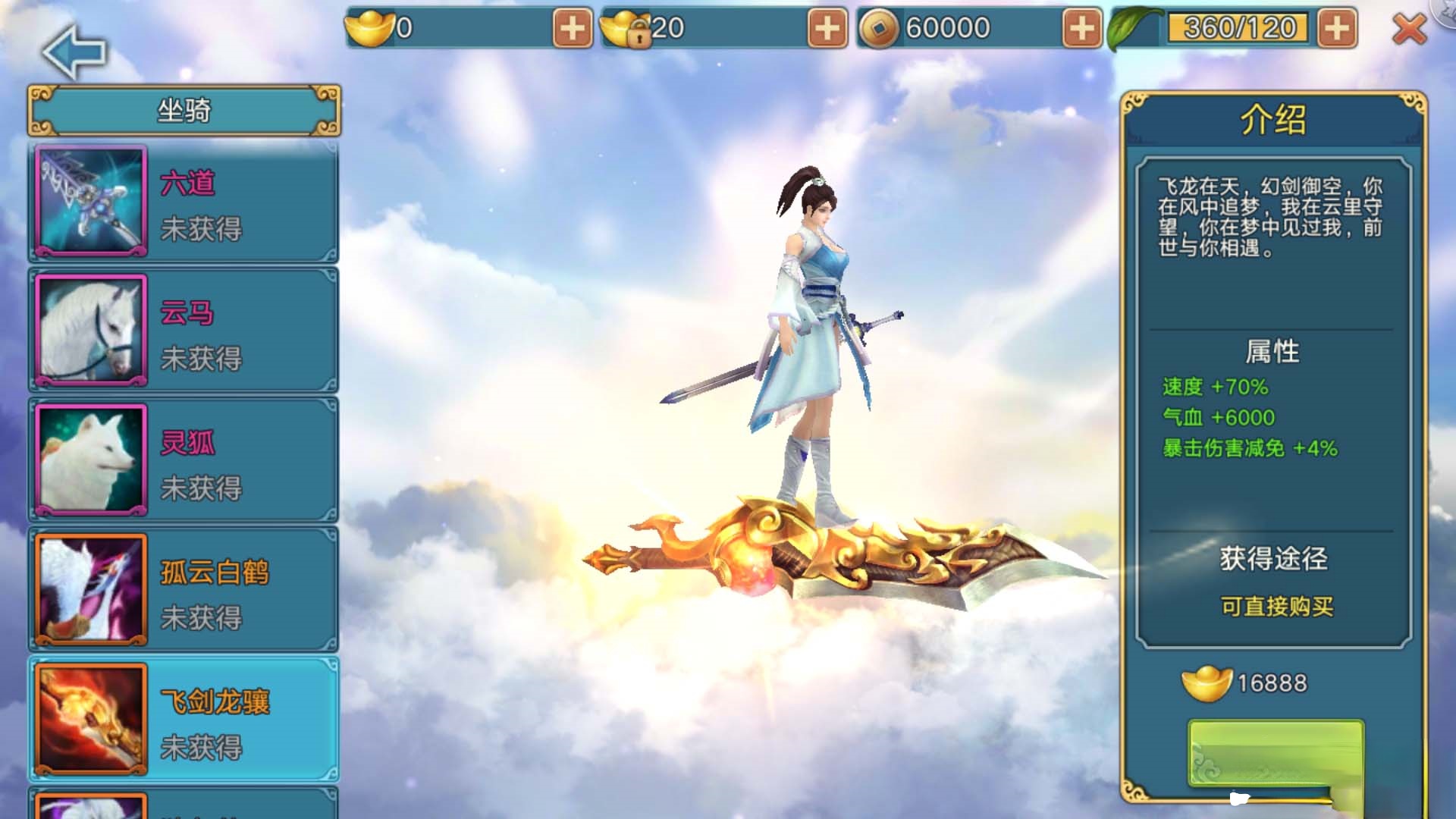 7.增加敖霆、火麒麟、赤翼墨血兽、月兔新坐骑并且开放其他坐骑直接购买