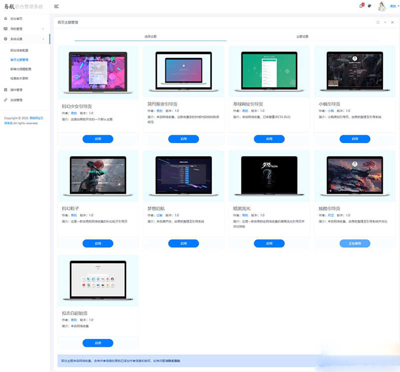 易航网址导航系统源码,完美去授权。采用光年全新v5模板开发后台,后台内置8款主题色,分别是简约白、炫光绿、渐变紫、活力橙、少女粉、少女紫、科幻蓝、护眼黑。