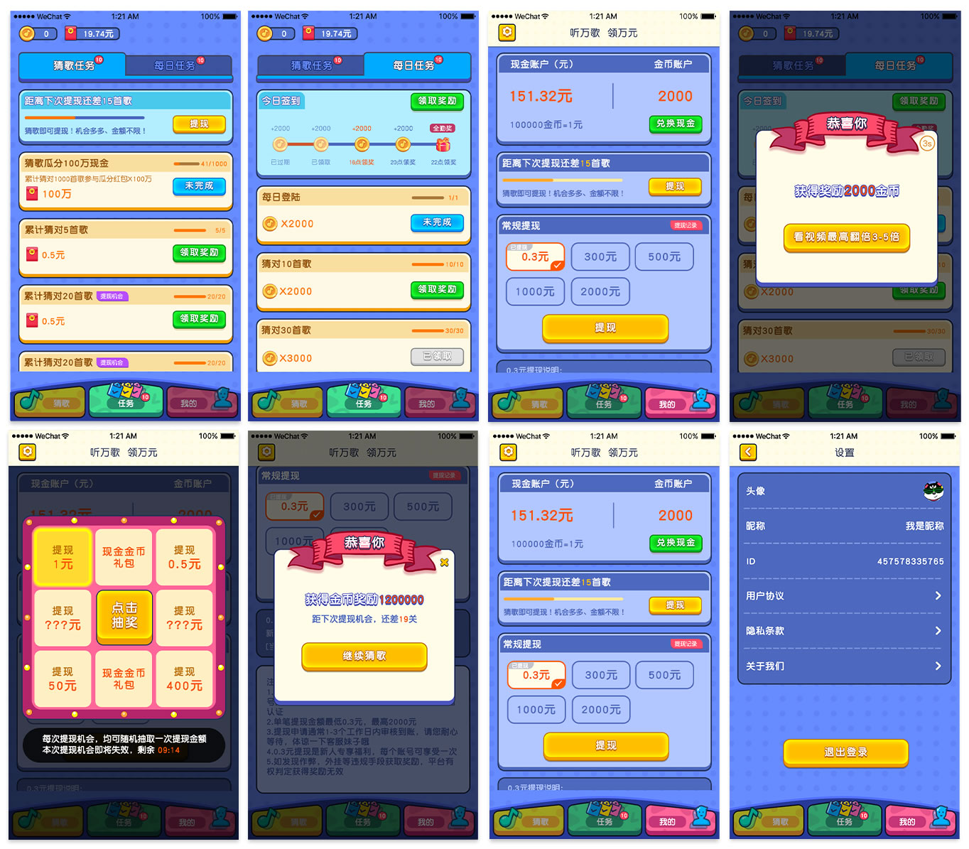 2. 玩家可以通过猜歌曲、拆红包和完成任务等途径获取金币奖励,当金币数量累积到一定数量时,可以兑换成现金。
